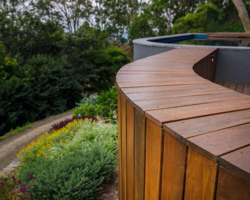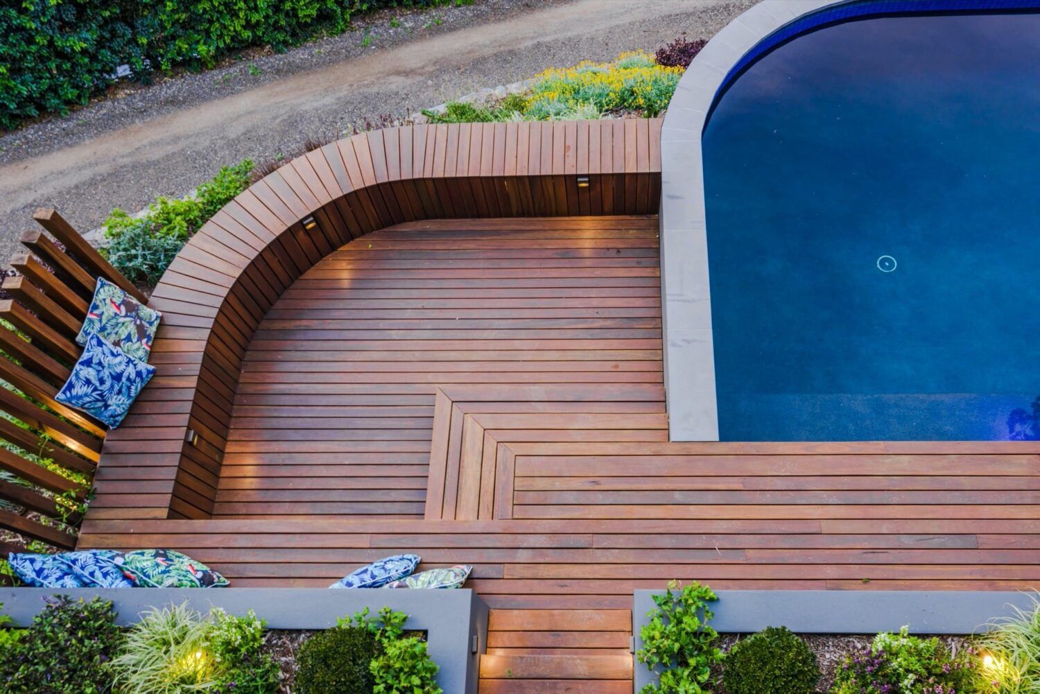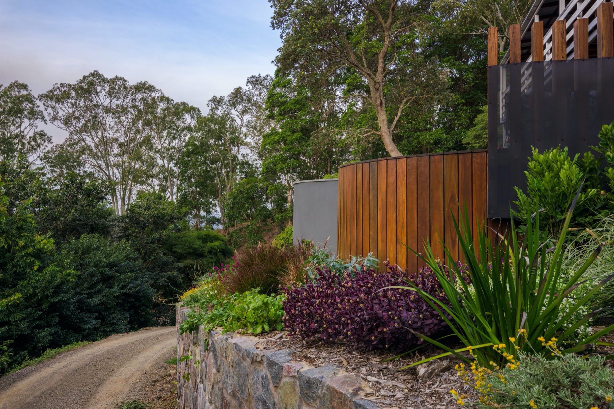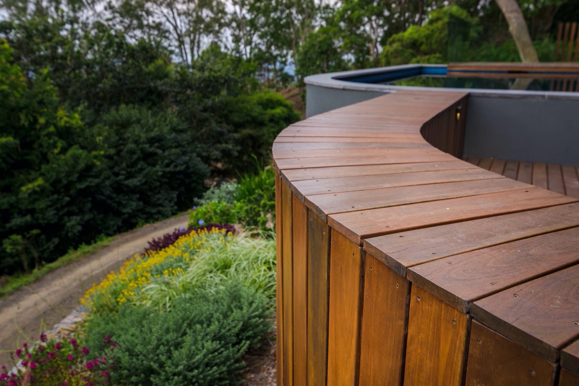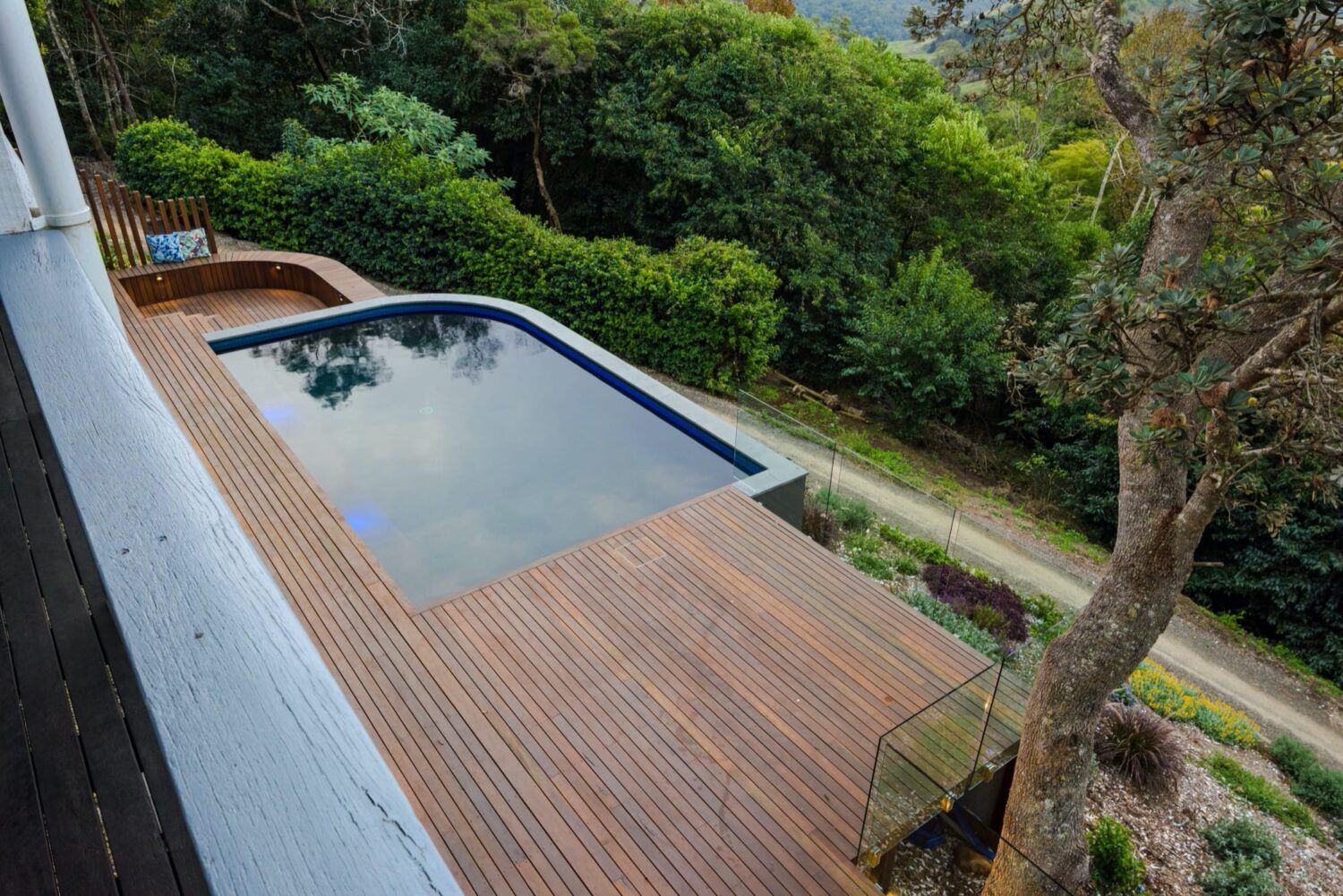 The scope of this project was for a pool, entertaining area with more usable space, improving the first view of the house, utilising the view of the bush surrounds and also the view of the coast ; with limited access and all within a slip zone this was a challenge. Not only the practical side of the engineering requirements for retaining walls, pool and deck in a slip zone- but the challenge of designing the project with a steeply sloping block and trying to blend all the structures into the surrounding environments. To not create a large flat boring deck surrounding the pool we broke the deck up into zones to create spaces for different requirements. The flat open deck to catch the sun for lounging around the pool, the long bench seat creates a space to watch the kids play in the pool, sitting in the afternoon shade while looking across the pool with views to the coast. The sunken lounge area is perfect for those cozy nights with friends , while the change of height works both with certification in regards to pool fence and balustrade requirements and gives the slightly hidden away feeling. The main design feature of the project was the curved pool and deck. A sharp corner of both pool and deck would have been an eyesore, the curve created softness and blended it into the surroundings while creating a unique feature to the project. The gardens needed to both blend with the bushland surrounds up to the pool area but also take in the colder hinterland feel with splashes of colour and that country feel.