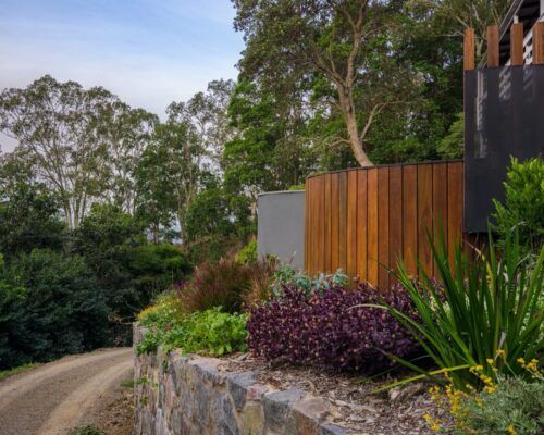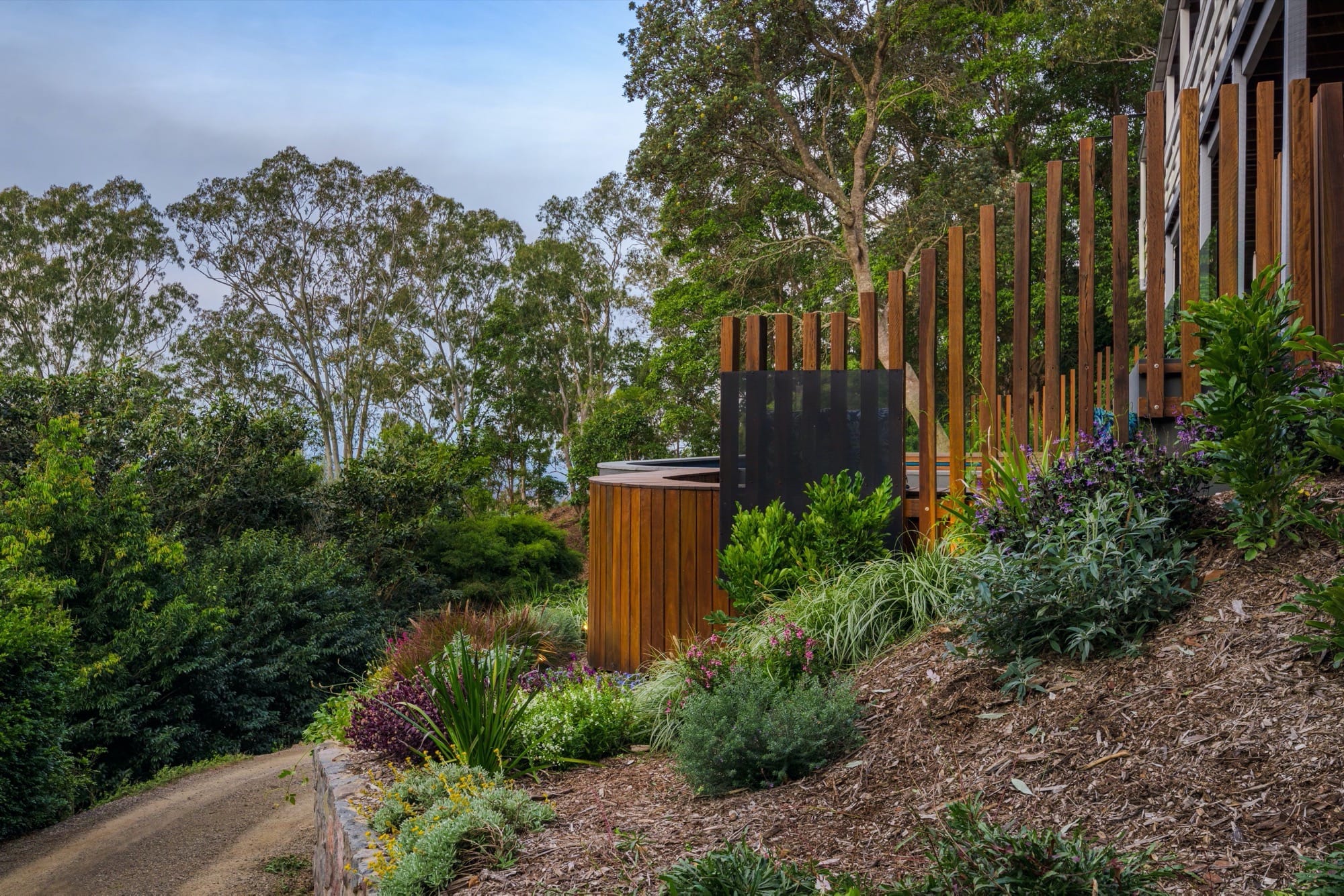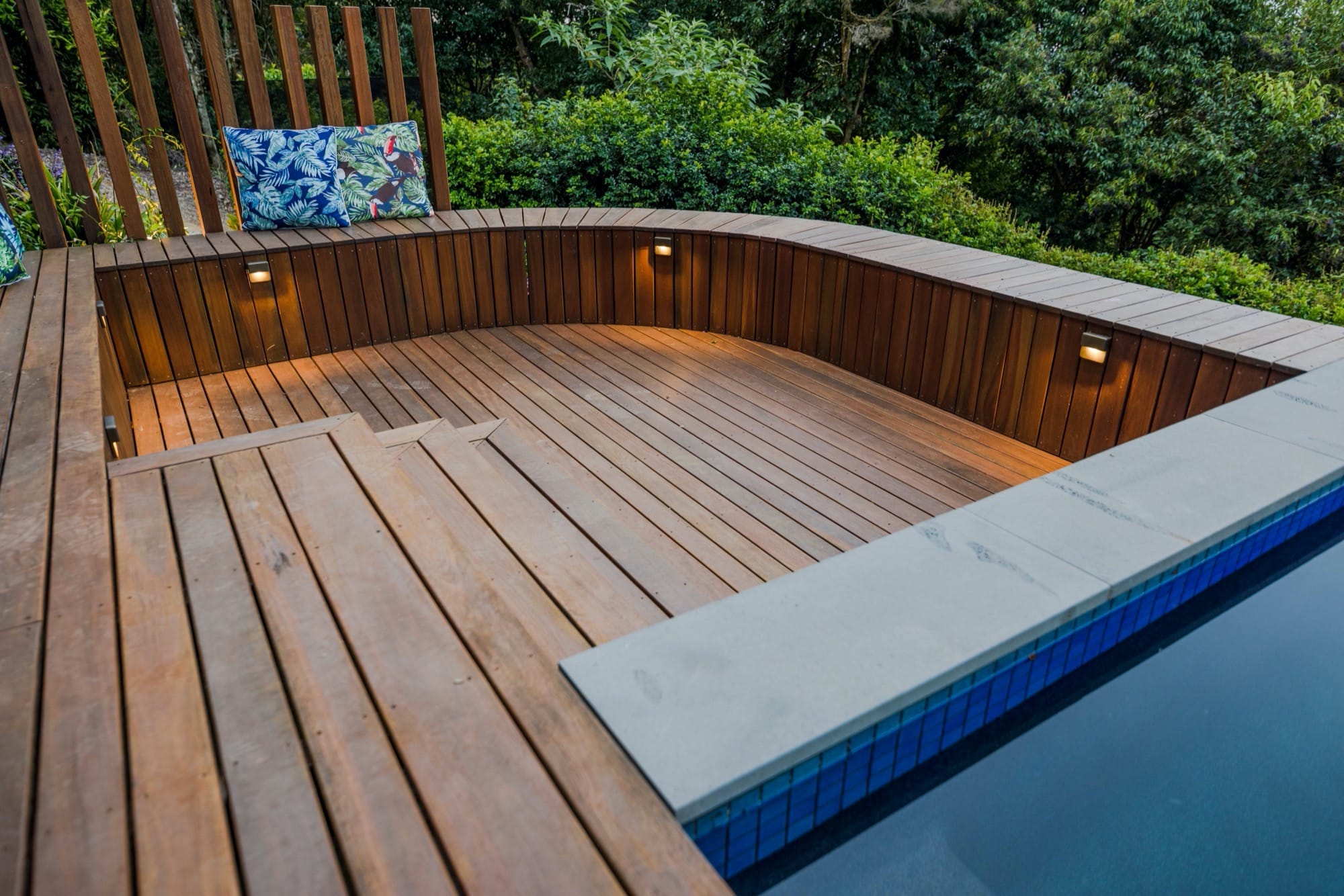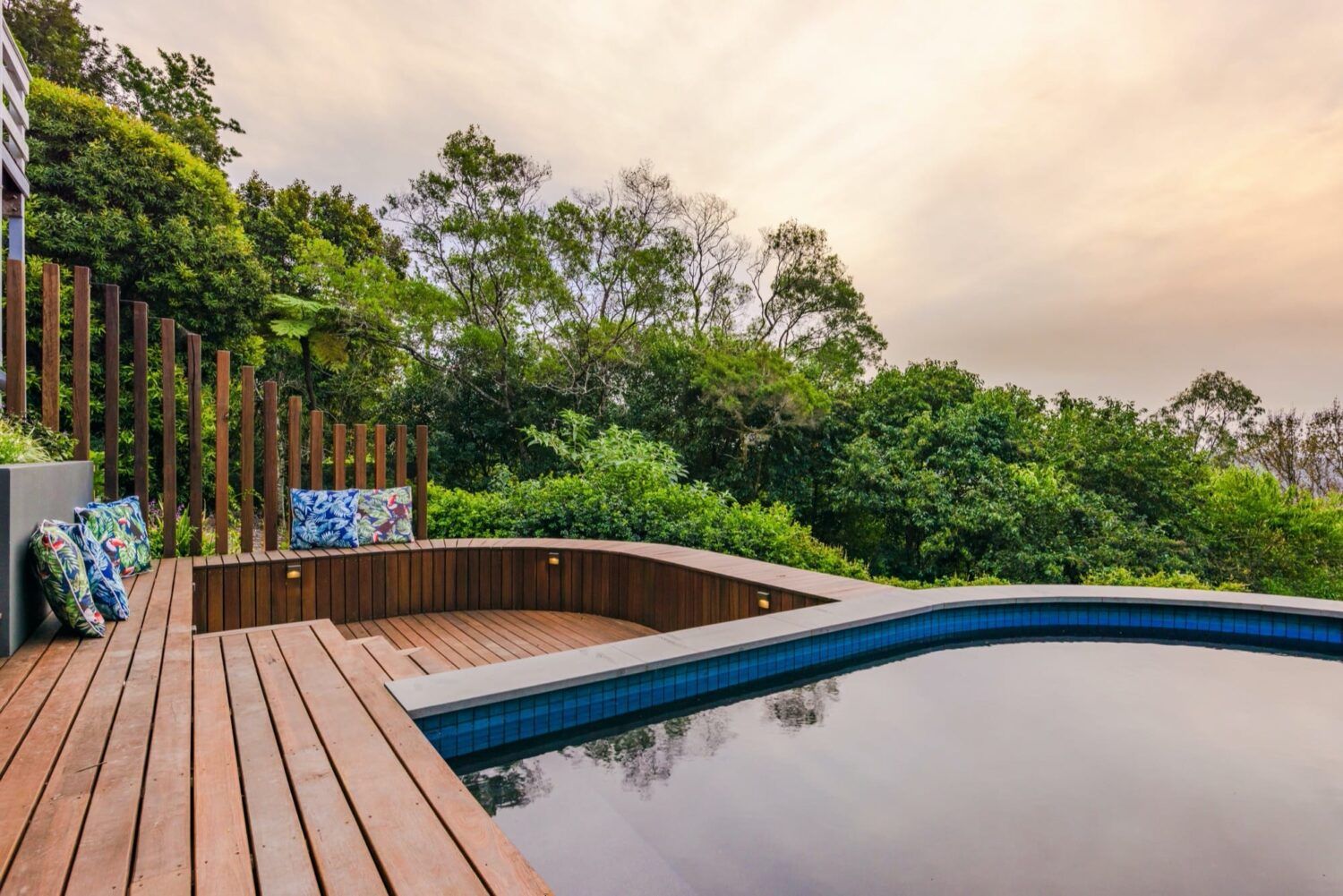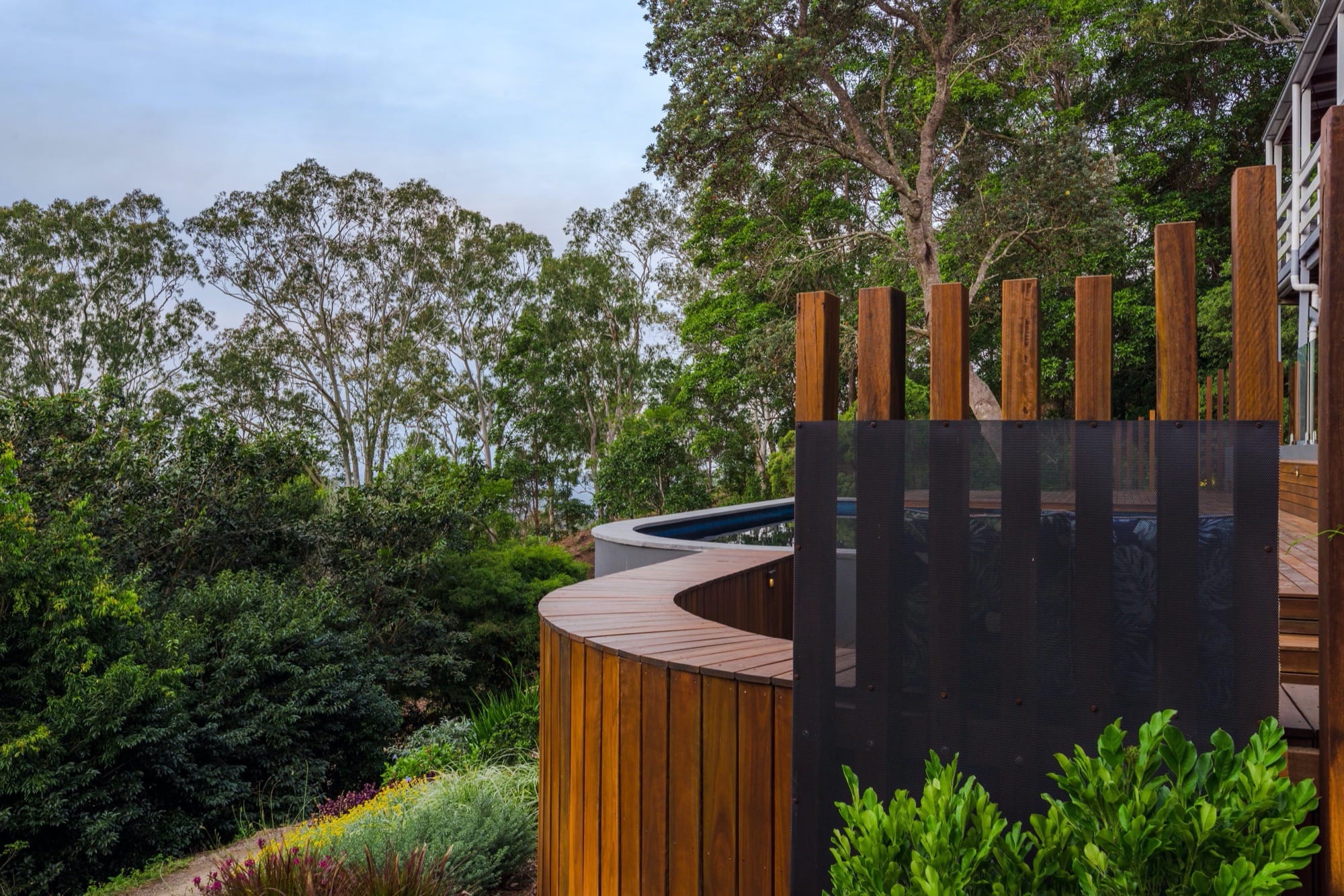 The scope of this project was for a pool, entertaining area with more usable space, improving the first view of the house, utilising the view of the bush surrounds and also the view of the coast ; with limited access and all within a slip zone this was a challenge. Not only the practical side of the engineering requirements for retaining walls, pool and deck in a slip zone- but the challenge of designing the project with a steeply sloping block and trying to blend all the structures into the surrounding environments. To not create a large flat boring deck surrounding the pool we broke the deck up into zones to create spaces for different requirements. The flat open deck to catch the sun for lounging around the pool, the long bench seat creates a space to watch the kids play in the pool, sitting in the afternoon shade while looking across the pool with views to the coast. The sunken lounge area is perfect for those cozy nights with friends , while the change of height works both with certification in regards to pool fence and balustrade requirements and gives the slightly hidden away feeling. The main design feature of the project was the curved pool and deck. A sharp corner of both pool and deck would have been an eyesore, the curve created softness and blended it into the surroundings while creating a unique feature to the project. The gardens needed to both blend with the bushland surrounds up to the pool area but also take in the colder hinterland feel with splashes of colour and that country feel.