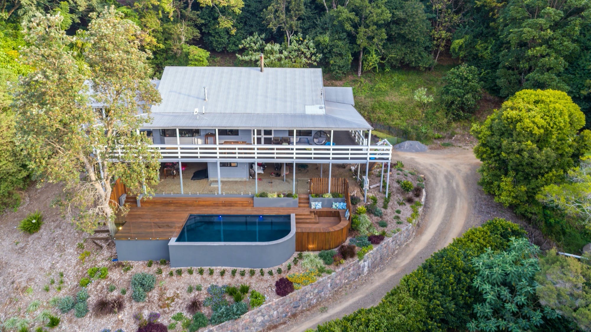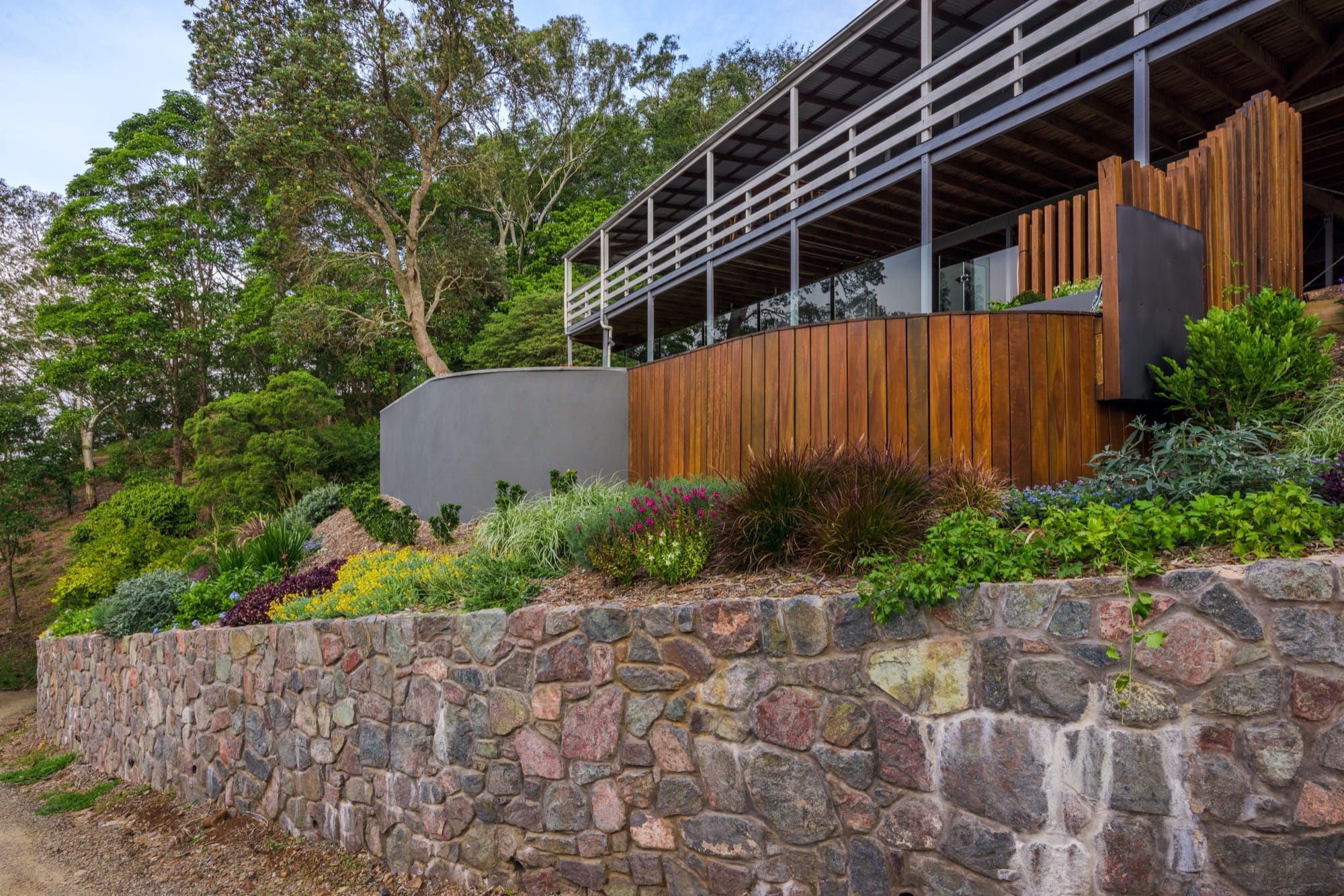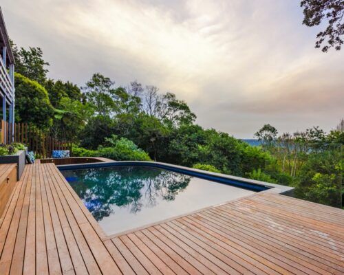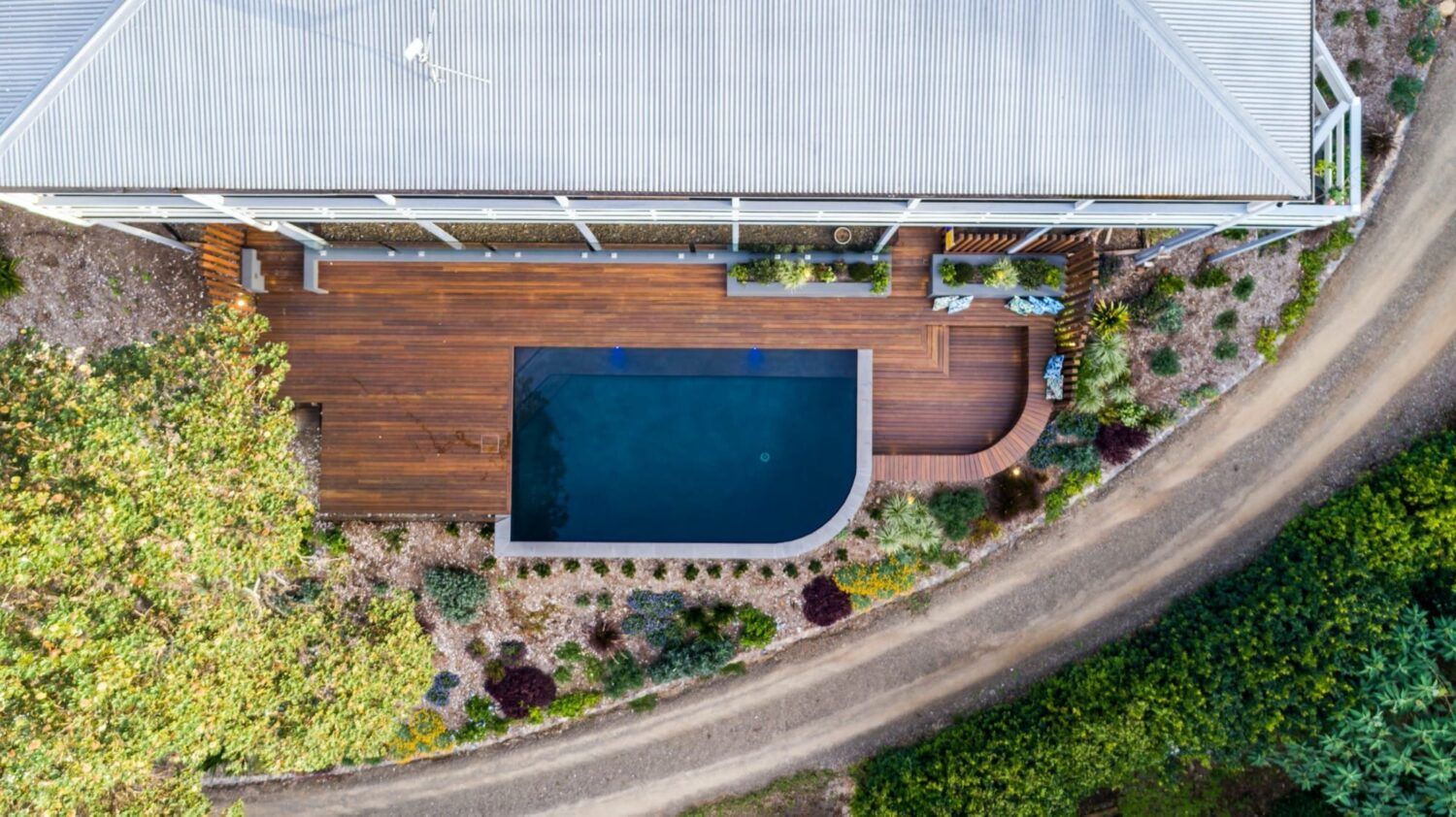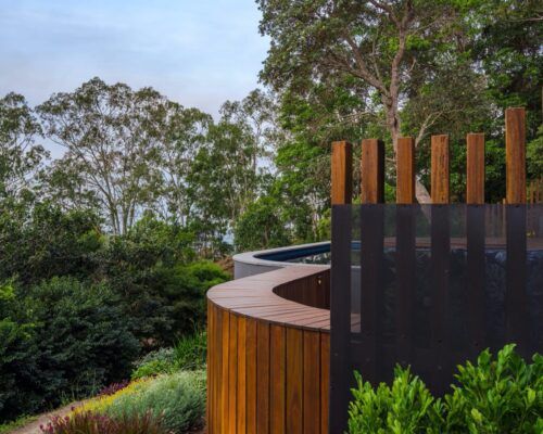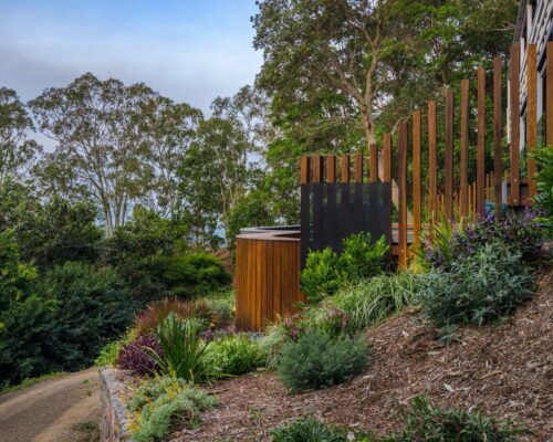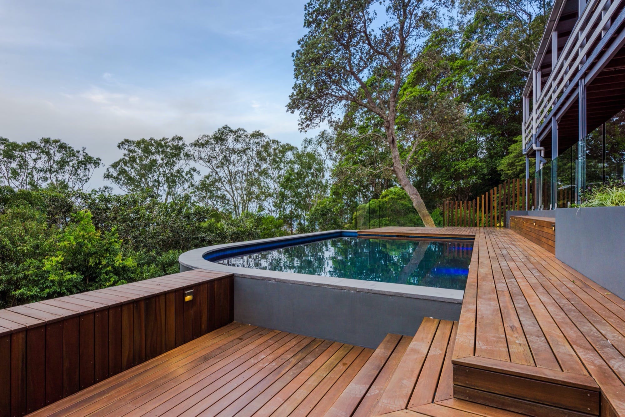 The scope of this project was for a pool, entertaining area with more usable space, improving the first view of the house, utilising the view of the bush surrounds and also the view of the coast ; with limited access and all within a slip zone this was a challenge. Not only the practical side of the engineering requirements for retaining walls, pool and deck in a slip zone- but the challenge of designing the project with a steeply sloping block and trying to blend all the structures into the surrounding environments. To not create a large flat boring deck surrounding the pool we broke the deck up into zones to create spaces for different requirements. The flat open deck to catch the sun for lounging around the pool, the long bench seat creates a space to watch the kids play in the pool, sitting in the afternoon shade while looking across the pool with views to the coast. The sunken lounge area is perfect for those cozy nights with friends , while the change of height works both with certification in regards to pool fence and balustrade requirements and gives the slightly hidden away feeling. The main design feature of the project was the curved pool and deck. A sharp corner of both pool and deck would have been an eyesore, the curve created softness and blended it into the surroundings while creating a unique feature to the project. The gardens needed to both blend with the bushland surrounds up to the pool area but also take in the colder hinterland feel with splashes of colour and that country feel.