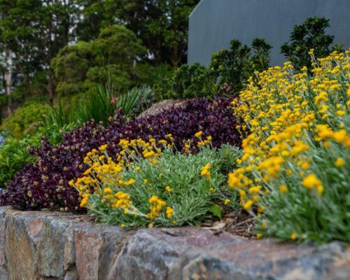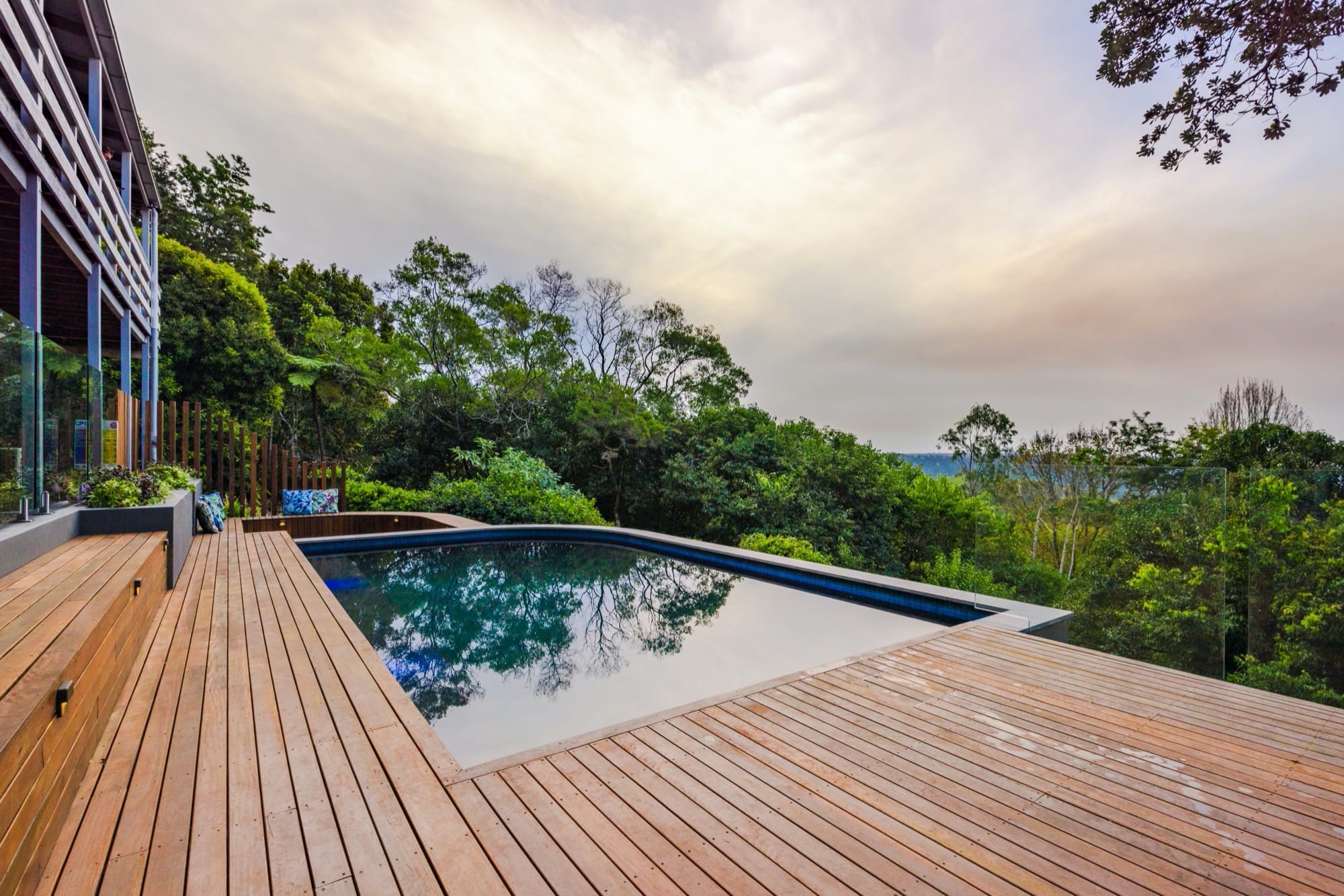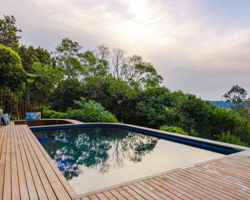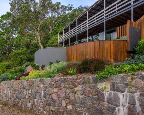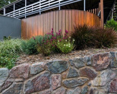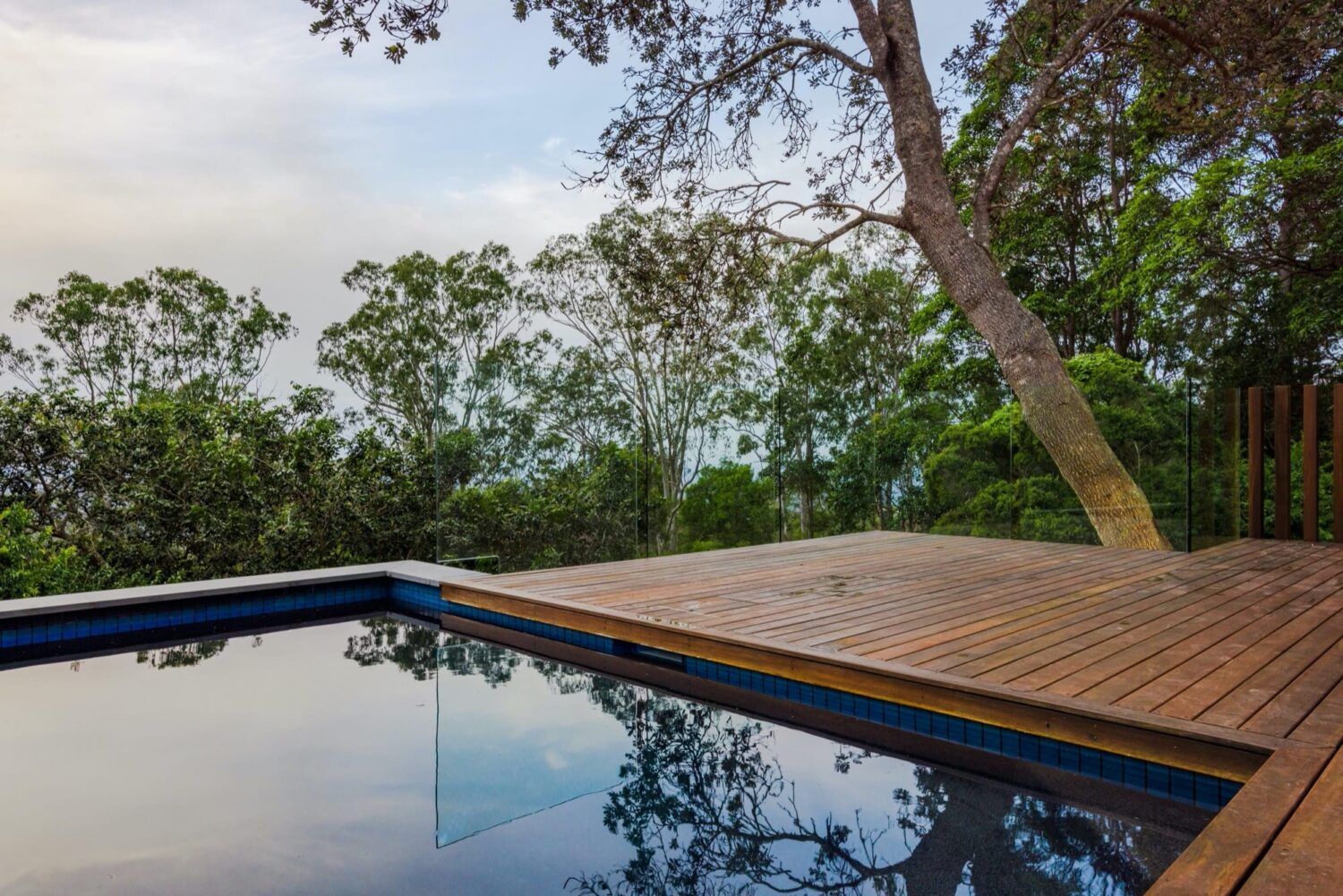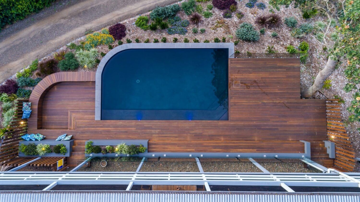 The scope of this project was for a pool, entertaining area with more usable space, improving the first view of the house, utilising the view of the bush surrounds and also the view of the coast ; with limited access and all within a slip zone this was a challenge. Not only the practical side of the engineering requirements for retaining walls, pool and deck in a slip zone- but the challenge of designing the project with a steeply sloping block and trying to blend all the structures into the surrounding environments. To not create a large flat boring deck surrounding the pool we broke the deck up into zones to create spaces for different requirements. The flat open deck to catch the sun for lounging around the pool, the long bench seat creates a space to watch the kids play in the pool, sitting in the afternoon shade while looking across the pool with views to the coast. The sunken lounge area is perfect for those cozy nights with friends , while the change of height works both with certification in regards to pool fence and balustrade requirements and gives the slightly hidden away feeling. The main design feature of the project was the curved pool and deck. A sharp corner of both pool and deck would have been an eyesore, the curve created softness and blended it into the surroundings while creating a unique feature to the project. The gardens needed to both blend with the bushland surrounds up to the pool area but also take in the colder hinterland feel with splashes of colour and that country feel.