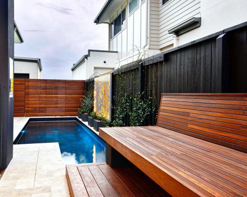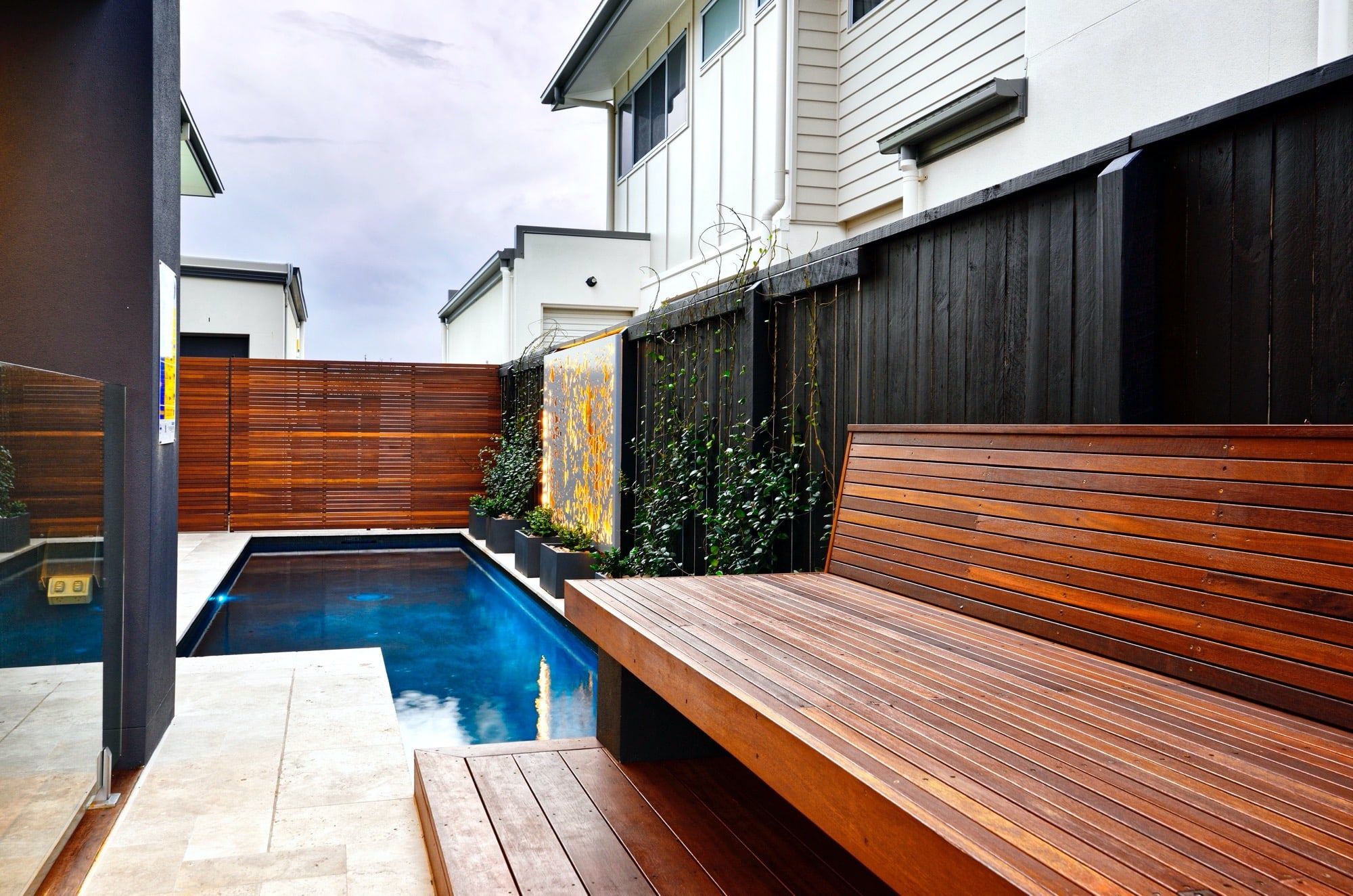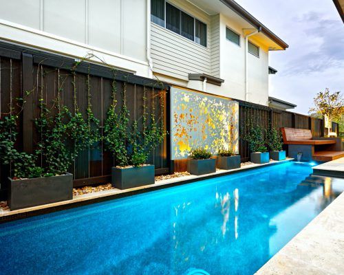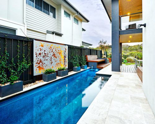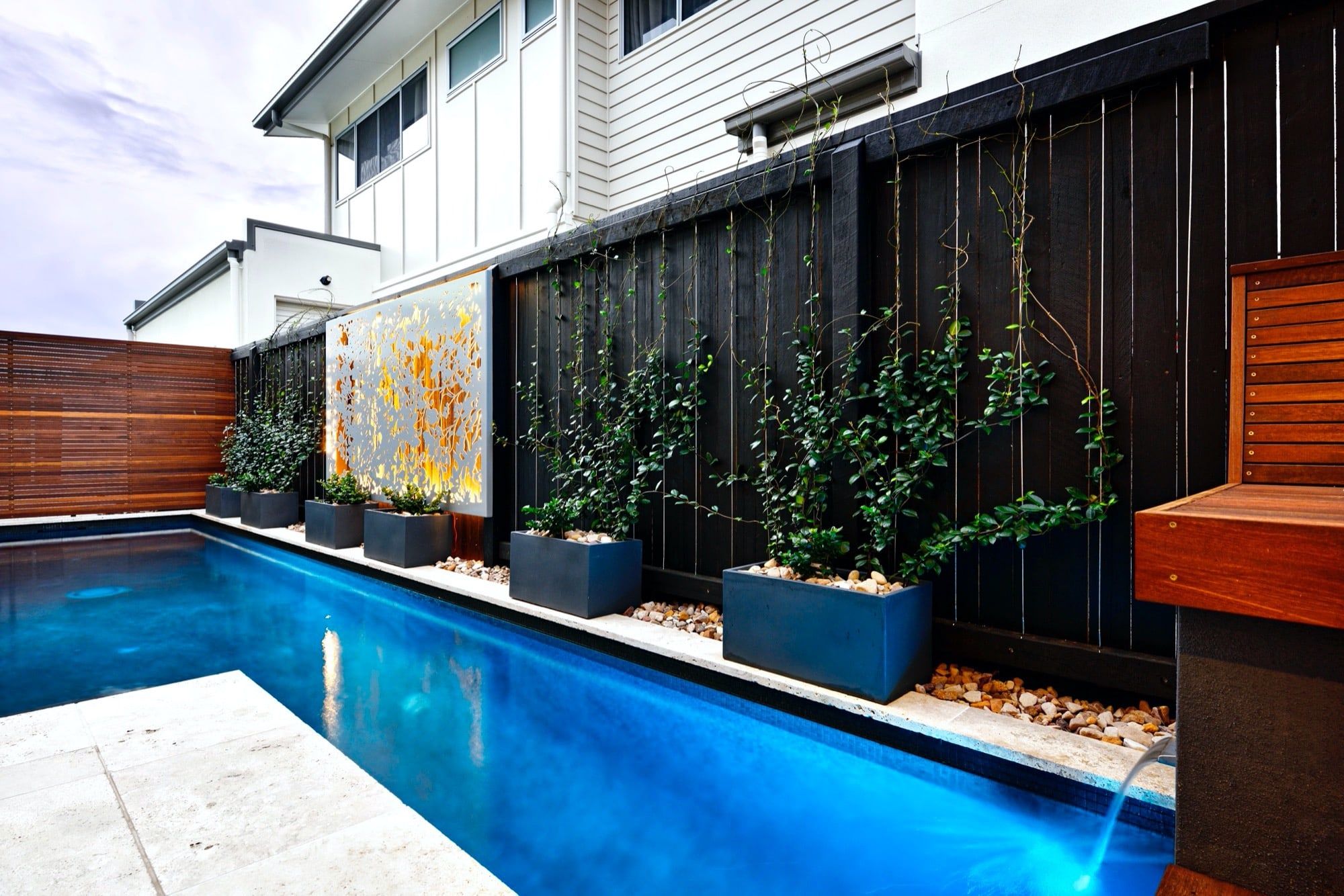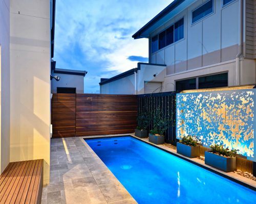 Built in poolside seating options, custom stainless steel water feature, custom laser cut screens and lighting which attract attention from all living areas within the home. Mission accomplished!