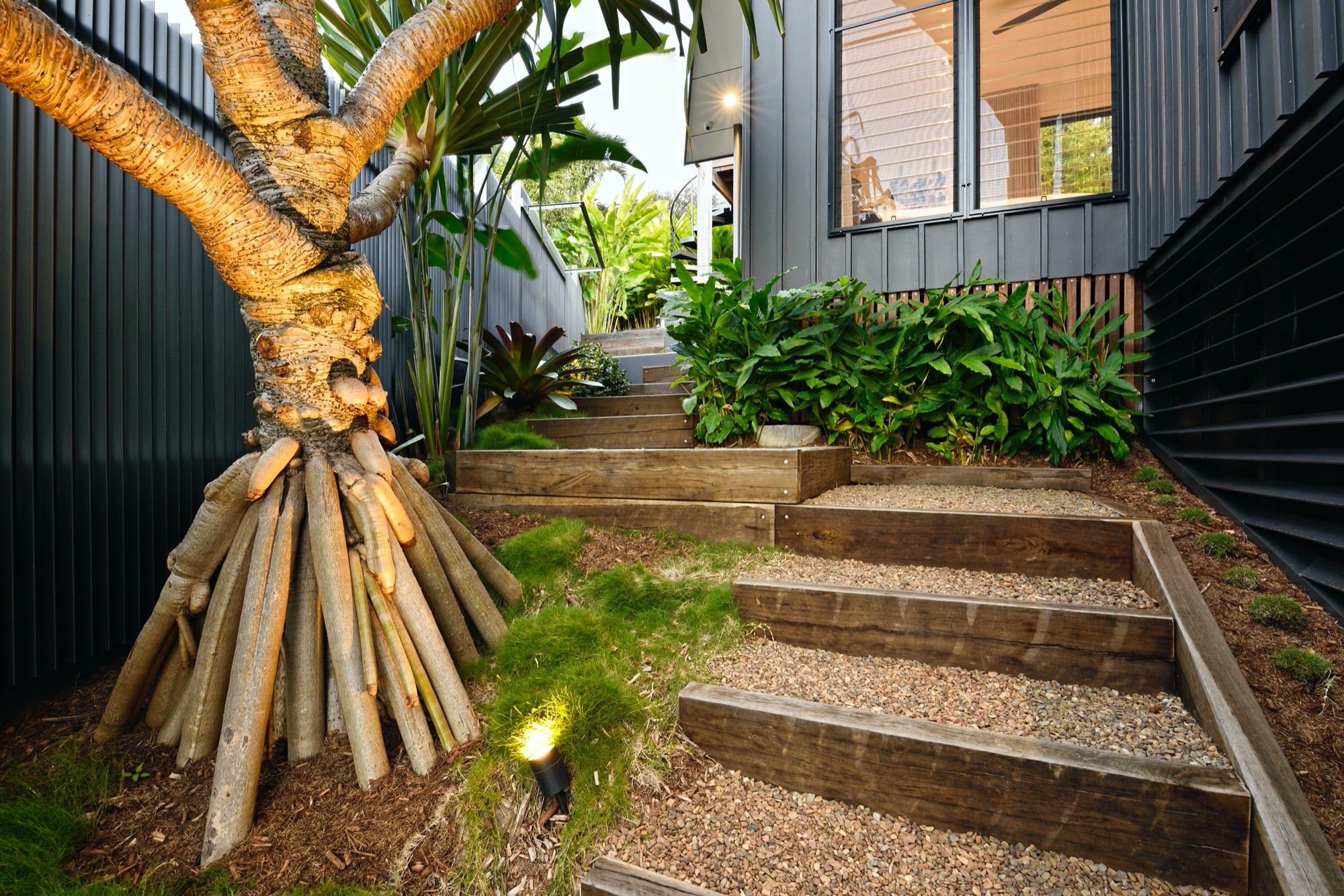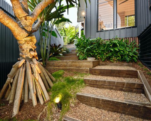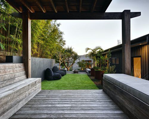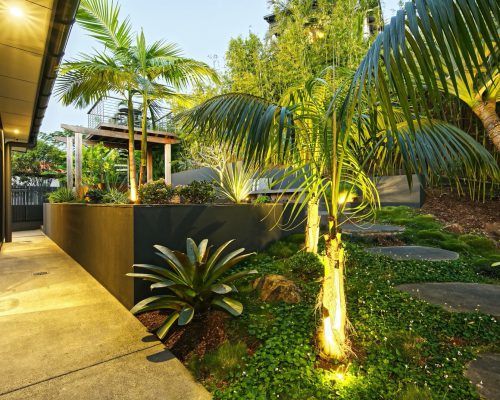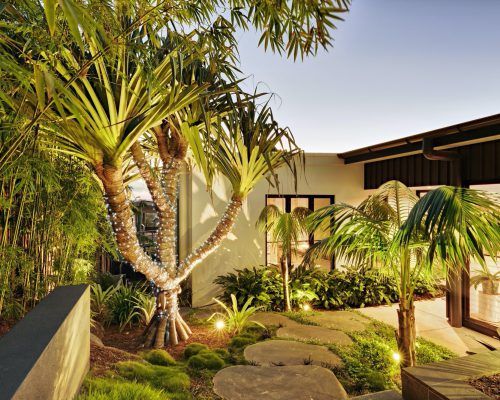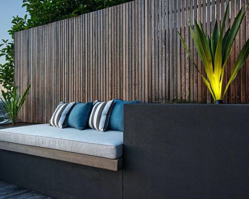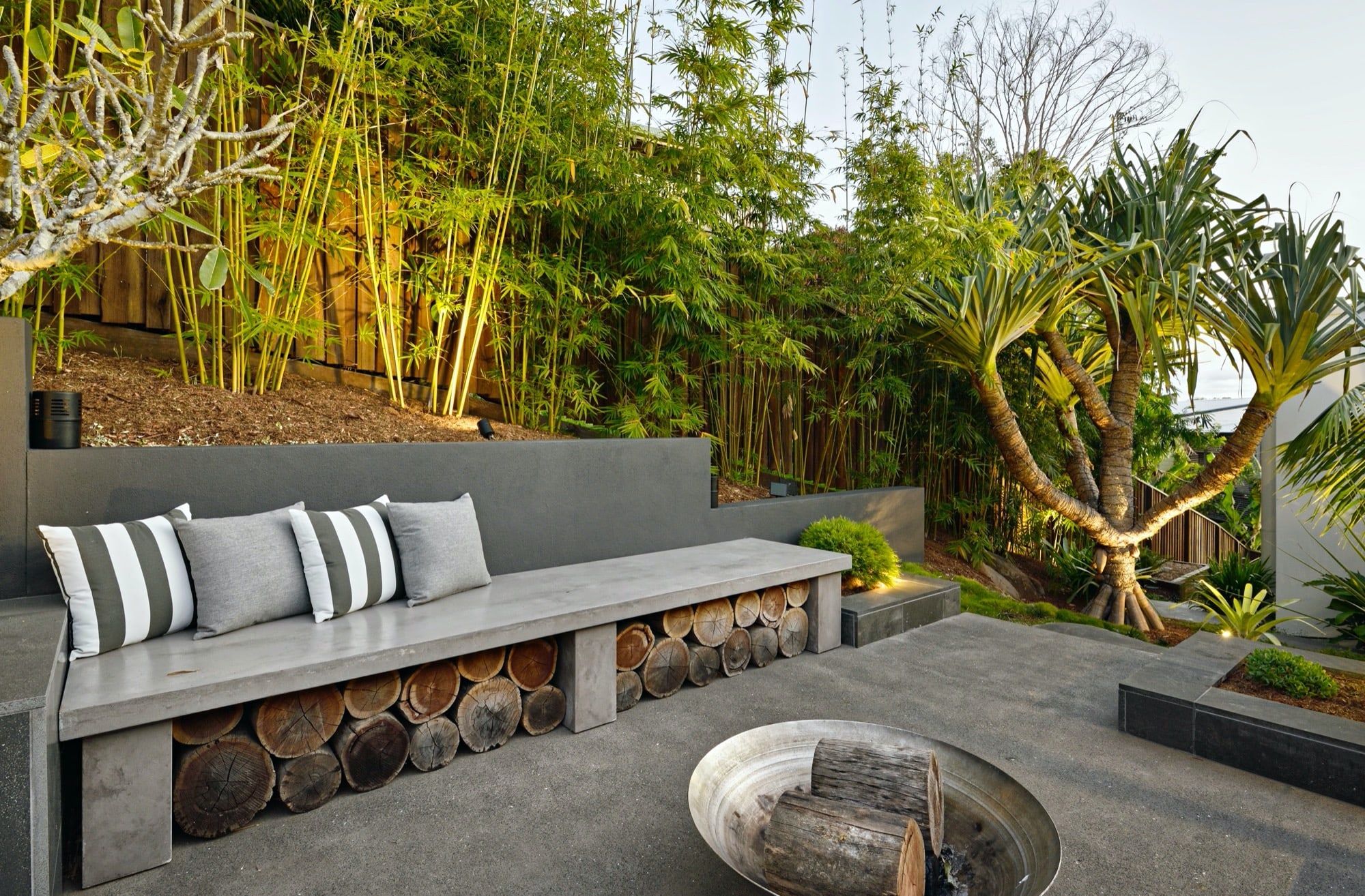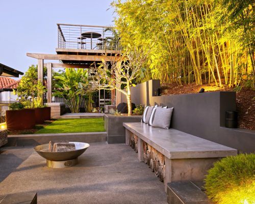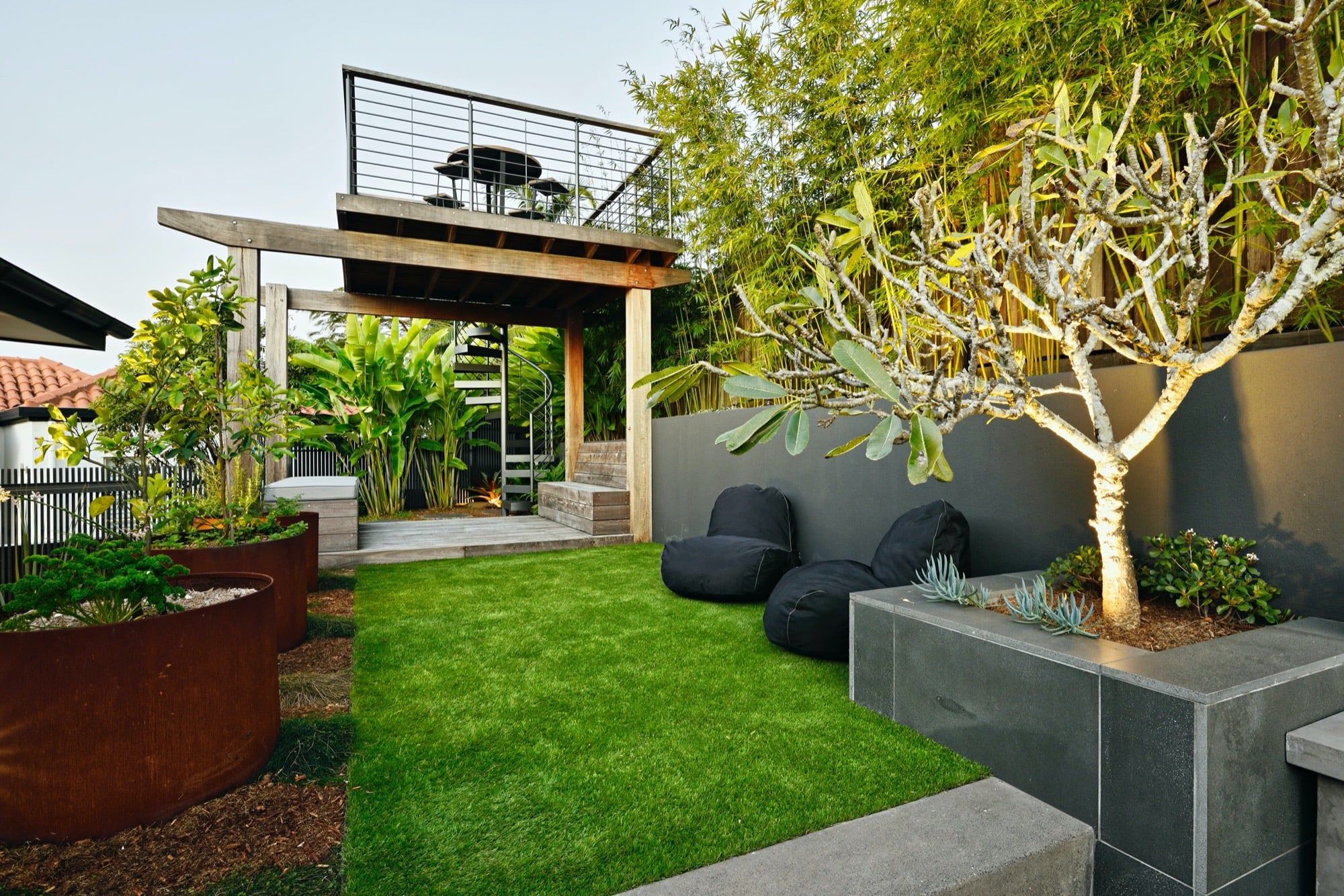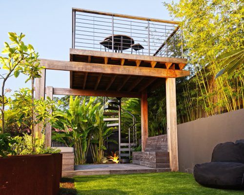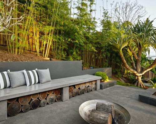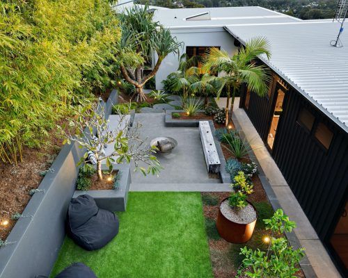 With two teenage children a traditional open back yard was not achievable therefore a kids retreat area was designed to give extra space and a usable outdoor area which was hidden away by the use of larger palms and plants. This area consists of recycled timber seating around a firepit, a viewing platform to check the surf and an undercover seating area for reading homework etc and synthetic grass to lazz about on.