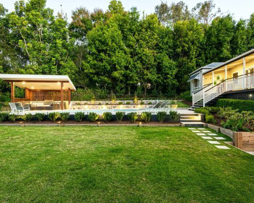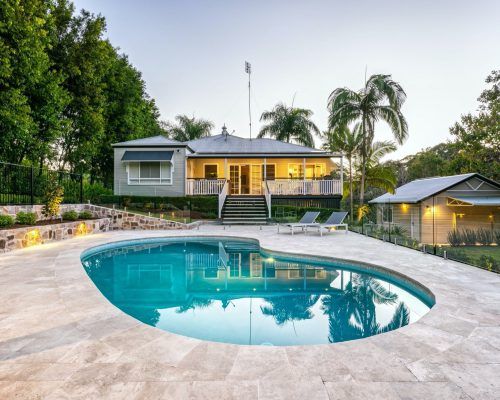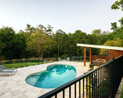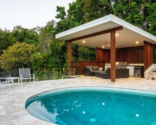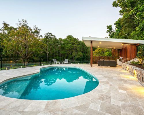 This Buderim property had a tired back yard that needed revamping into a functional outdoor entertaining hub. With an old pool already in place it was decided to totally renovate the pool including redoing the internal pebblecrete, new pool light, glass mosaic waterline tile, travertine coping and replace and relocate the pool filtration system.