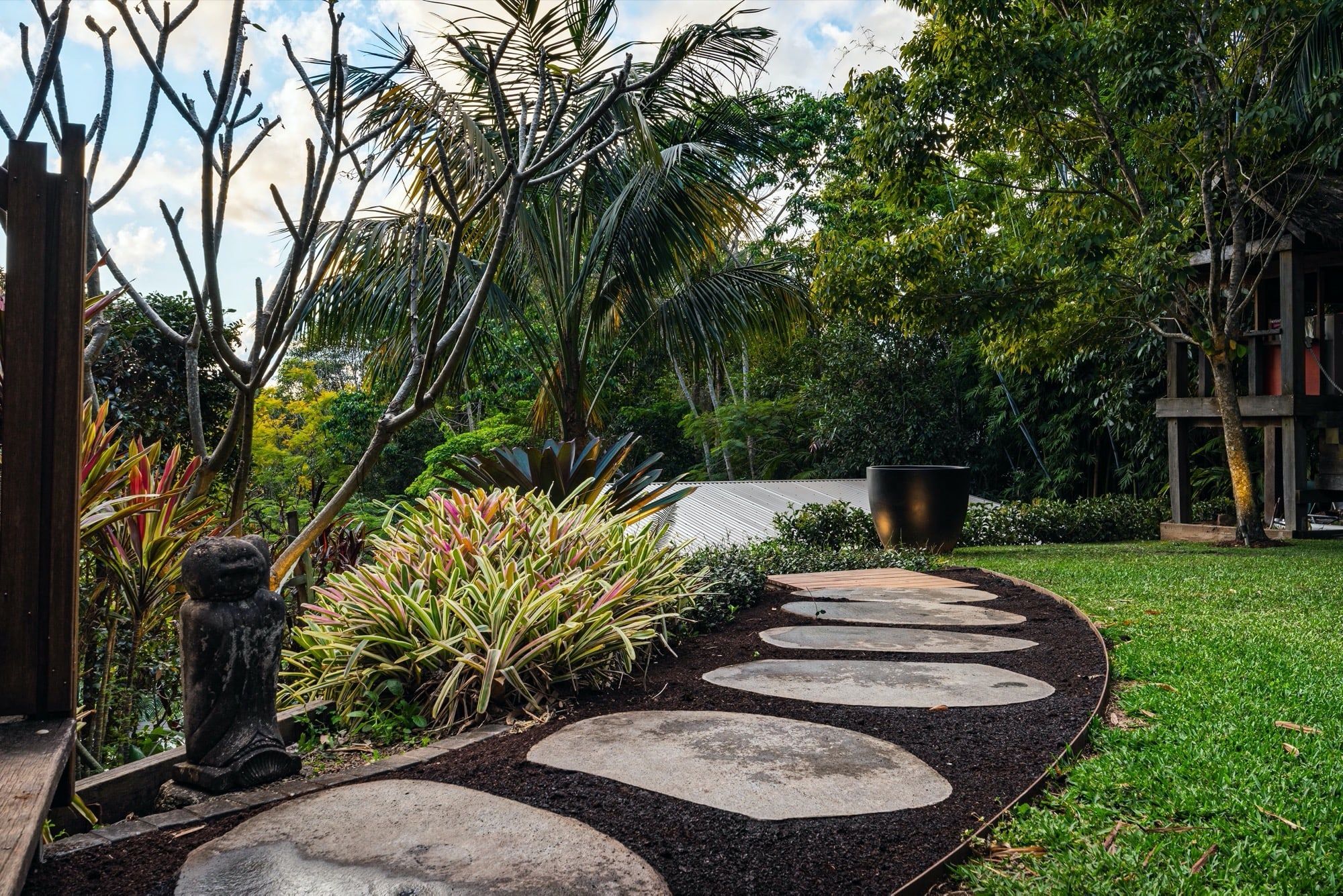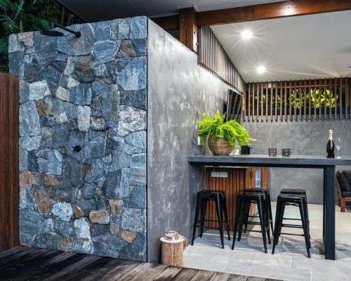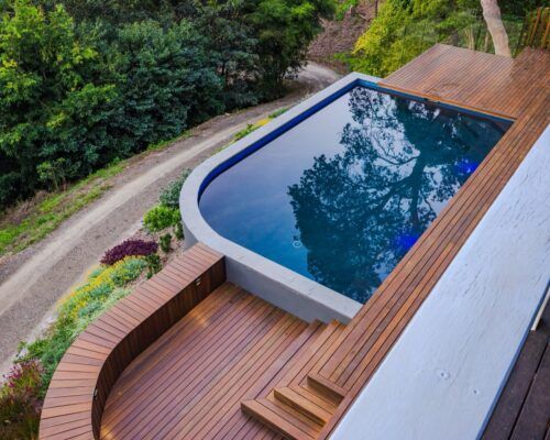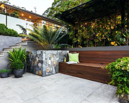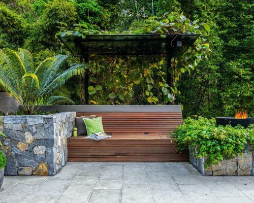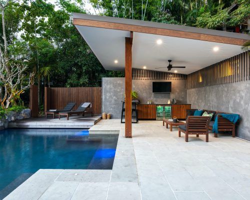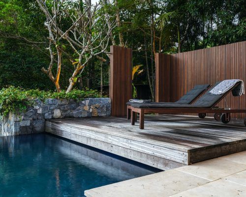 The hardscape elements were designed with natural tones and materials used to fit into the surrounding bush environment.. Limestone tiling in unique sizing was used to soften the area with balu decking allowed to grey off overhanging the pool to give it that floating feeling. Stone clad planter boxes were designed to highlight a feature in areas. Stained timber slats run vertically as a screen but also doubling as a pool fence at one end and then used on the day bed to tie in the theme.