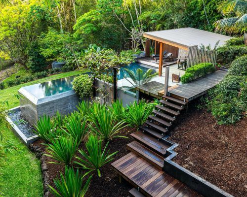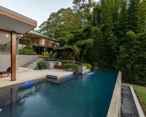 This acreage home situated on the Sunshine Coast proved a little challenging when faced with the design of a new bespoke pool area. Special consideration was required for the location of this pool and landscape site due to the very steep difficult landfall.
