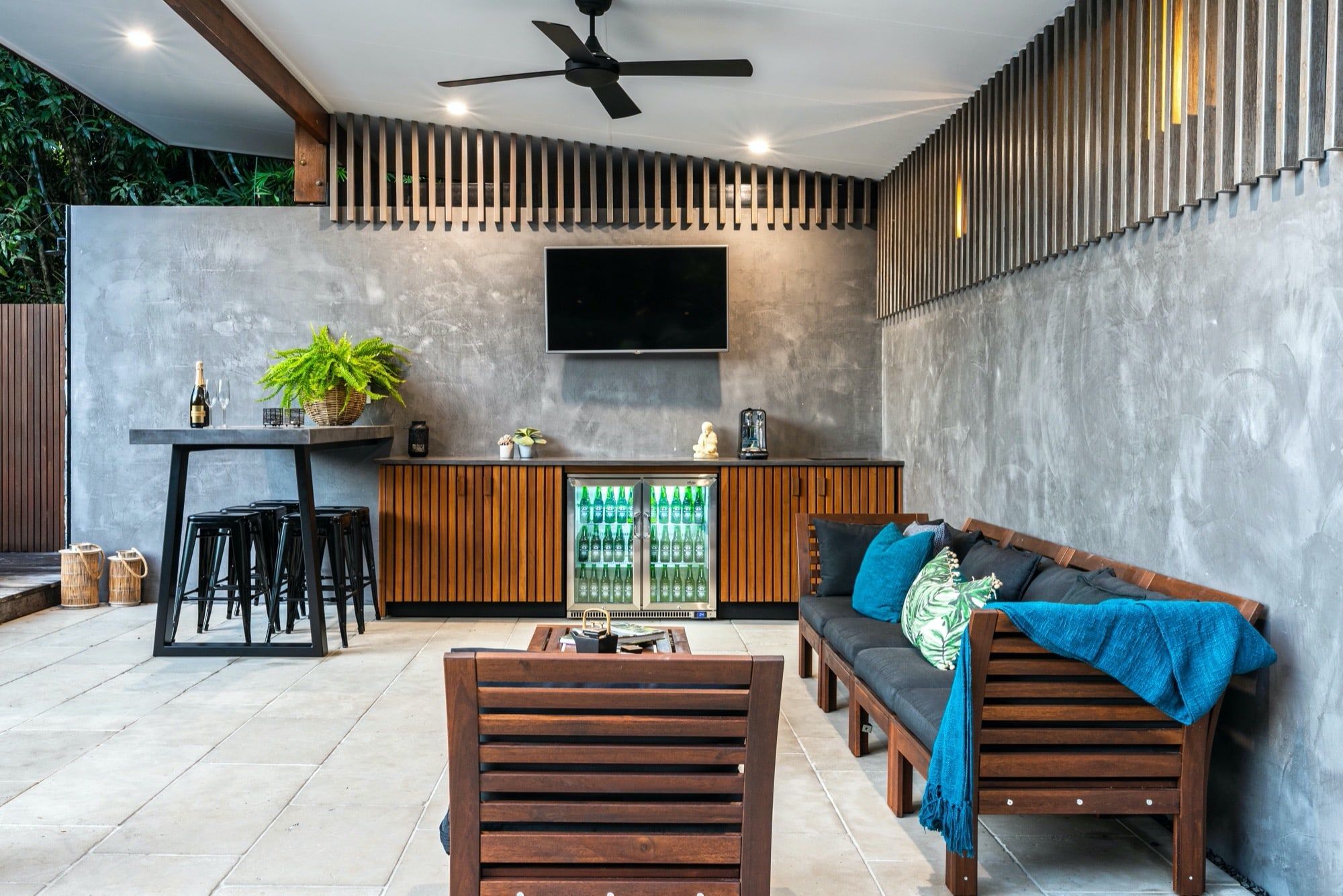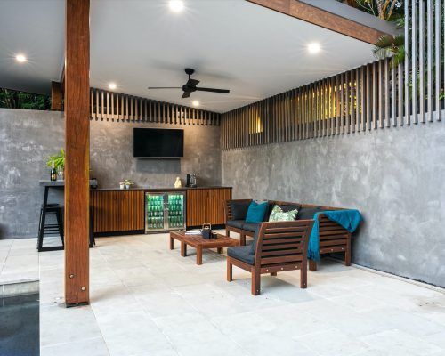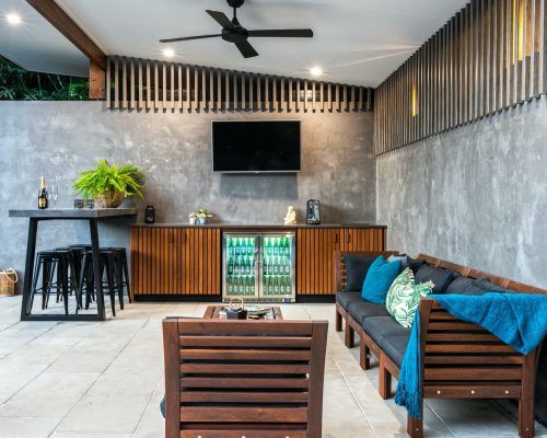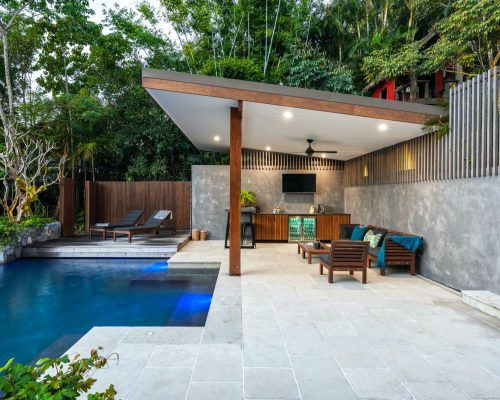 A pavilion was built to create lounge area to entertain around the pool including a custom made concrete kitchen benchtop and bar area, sink, under bench fridge, amplifier and surround sound speakers, TV, google home Hub/Wifi and full automation.