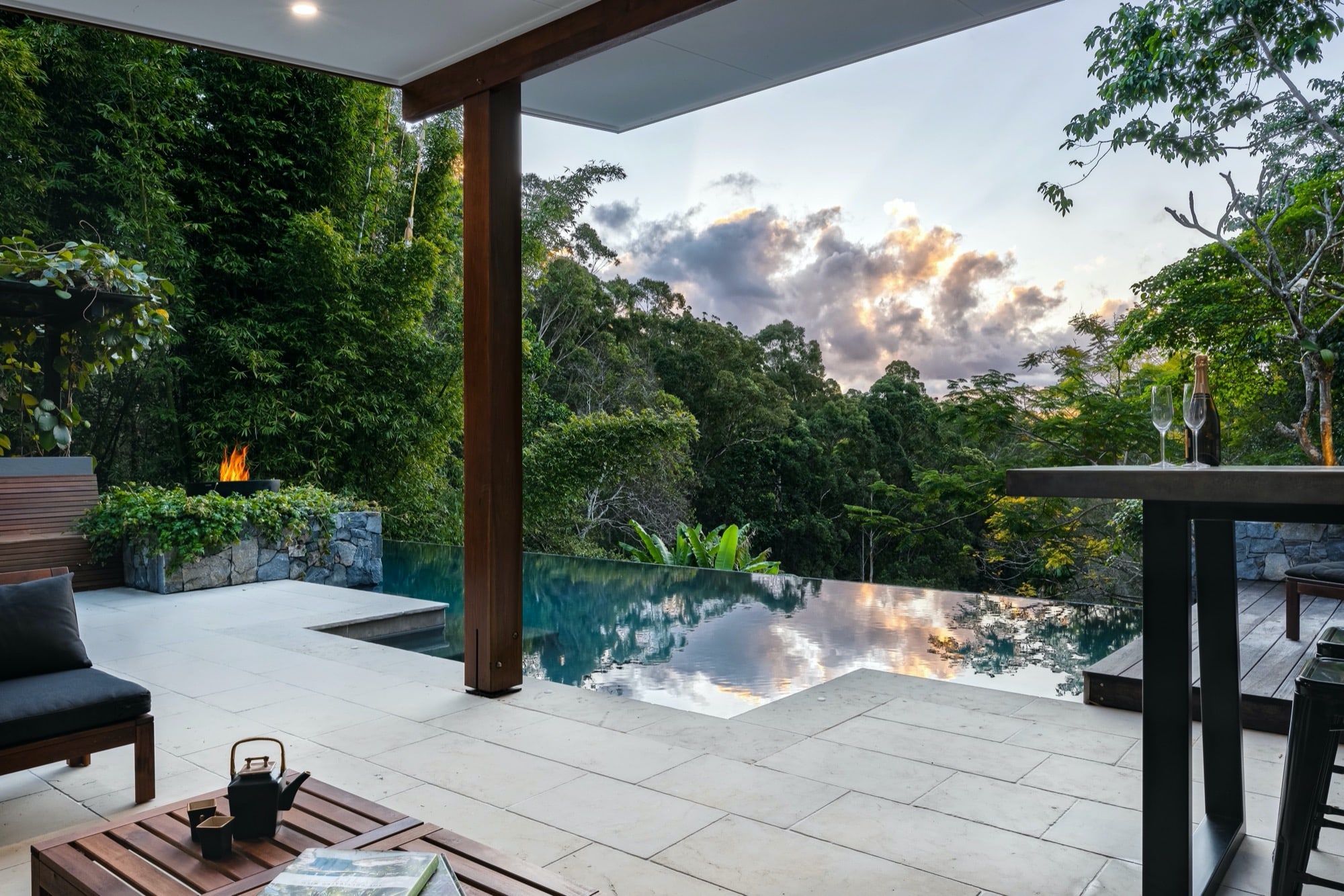 The pool itself has a very unique design. Working with the landfall, the pool sits approx 2.5m out of the ground at one end. A 3 sided infinity edge gives the impression that the far end of the pool is floating in the surrounding bush. Lineal limestone tiles were laid in individual pieces on the wet edge face as a feature.. A spa bench with jets and blowers fill the step-out area of the pool to sit back and enjoy the view.