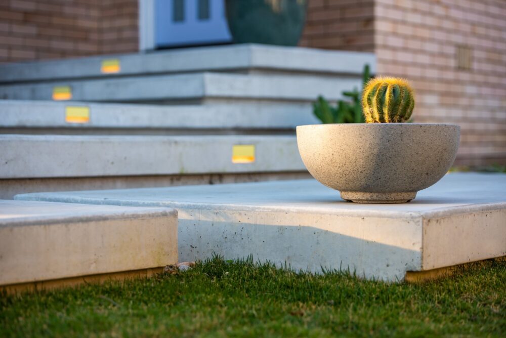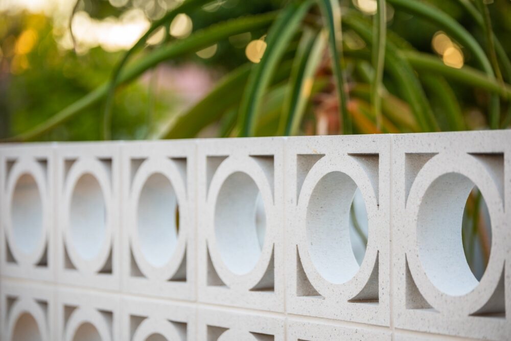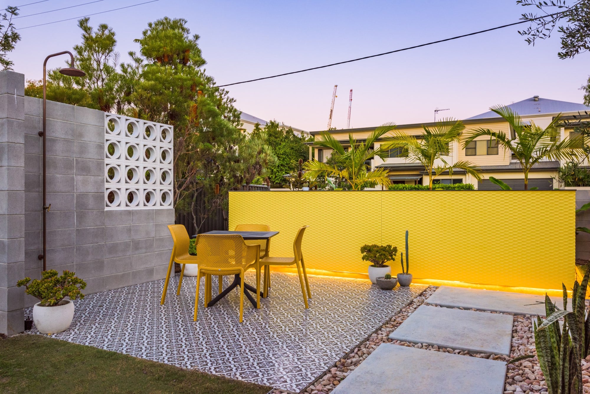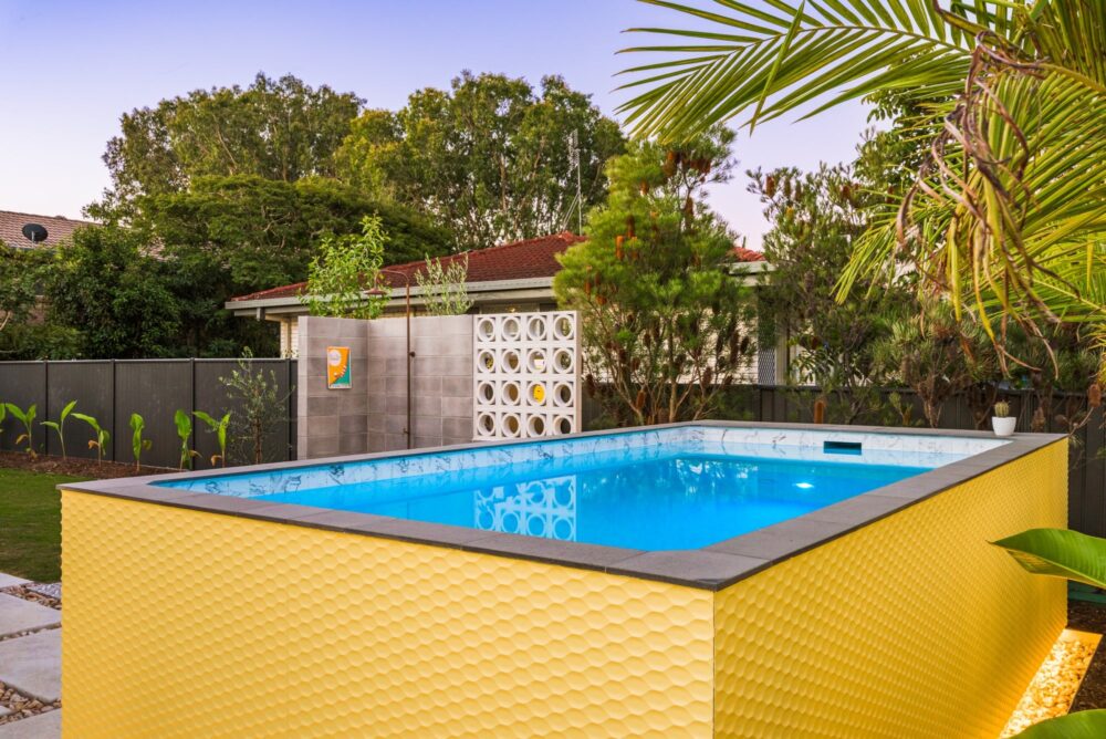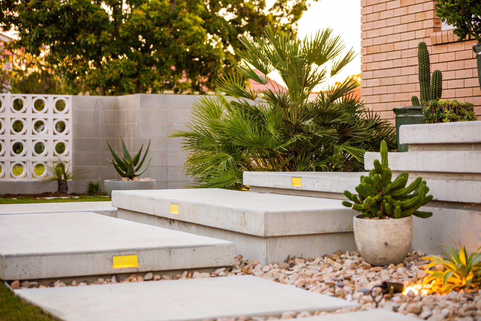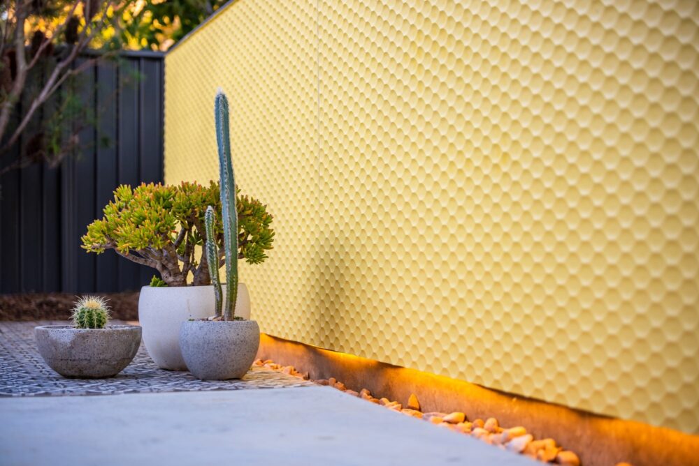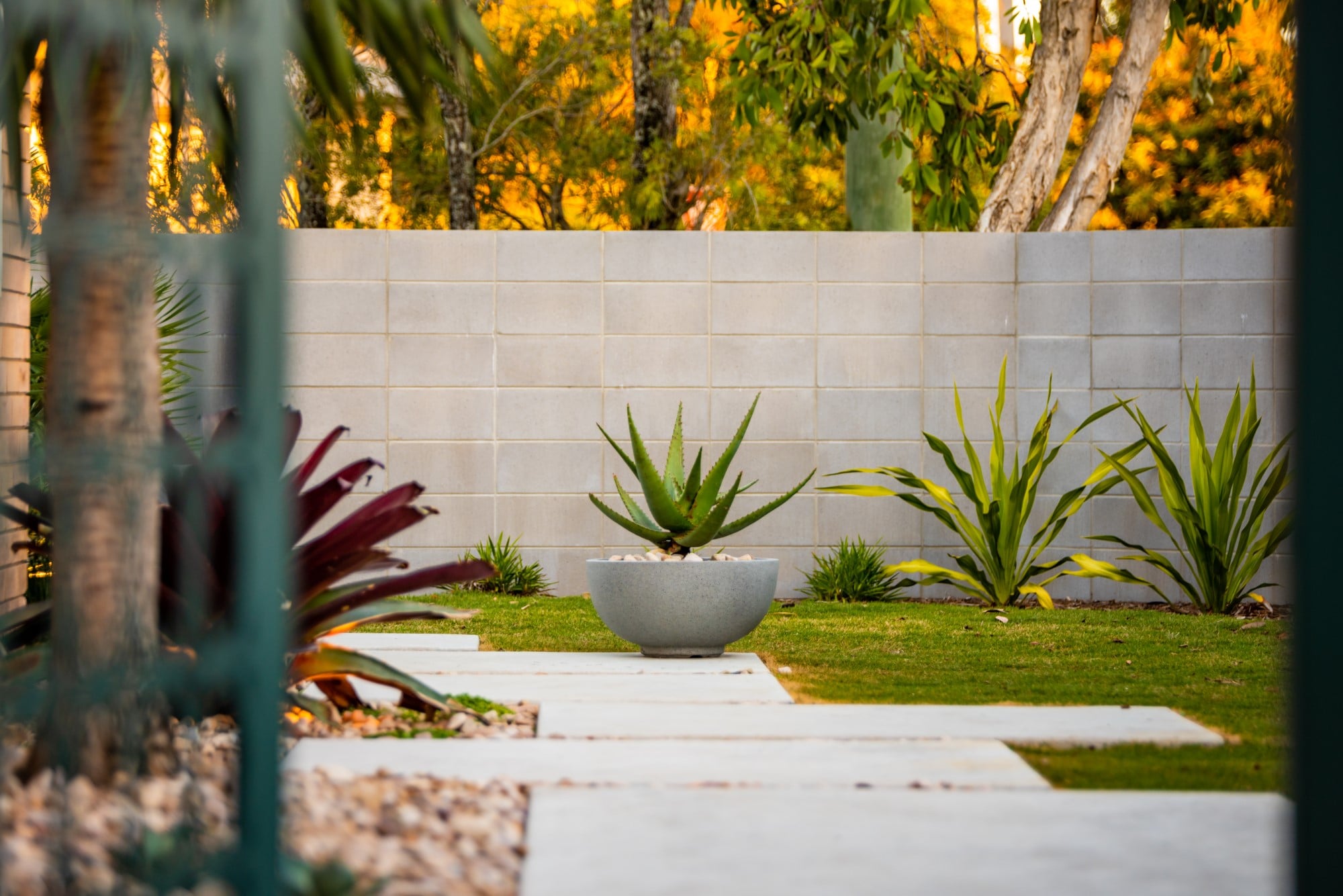 With a 1970 brick house in the middle of the block, it was either render the house to change the look or bring that style and feel into the landscaping surrounding the home. So a “Palm Springs, art deco’ inspired design was created. Situated on a corner block a boundary fence would be long and imposing so a block wall with feature breeze block sections and planter boxes were added. The plunge pool became a piece of art with a yellow 3D cladding on the outside to create a unique feature of the yard and especially at night with the glow of LED lights under the panels. Simple grey coloured concrete steppers provided a pathway throughout the property. Pebble gardens with simple arid planting suited the style while blending into the tropical plants around the pool area for that more lush and cooling feeling. Sir Grange Turf was laid with its small leaf and tight growth habit to simply blend in. Geometrical feature tiles were used to highlight the main areas upon entry and around the pool. Many other features inc a copper shower on a feature wall of grey block and breeze blocks, vintage style mailbox, copper ore coloured gates, custom step lights and garden lighting, cloud-based irrigation system , feature pots were used throughout the gardens and all lights, pool features can be controlled by voice or by a phone app from the Zimi system.
