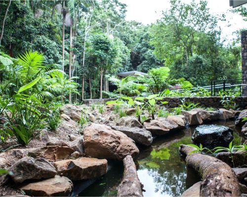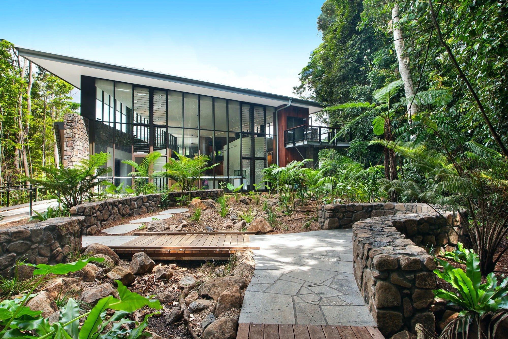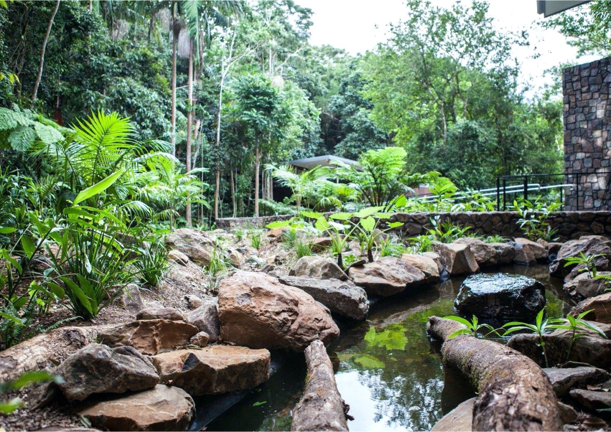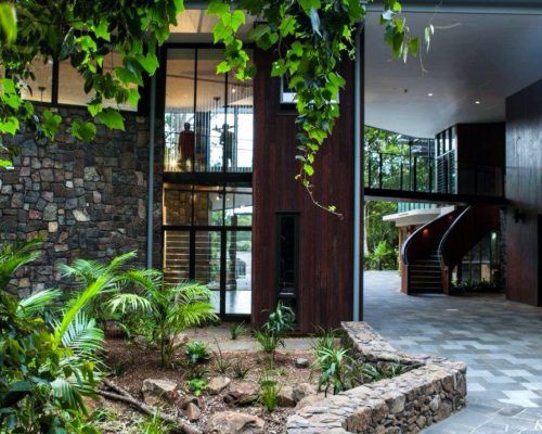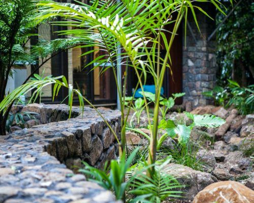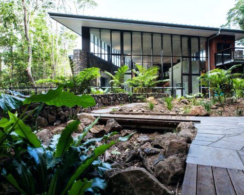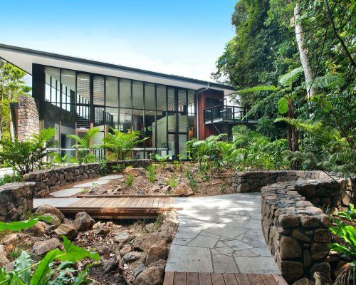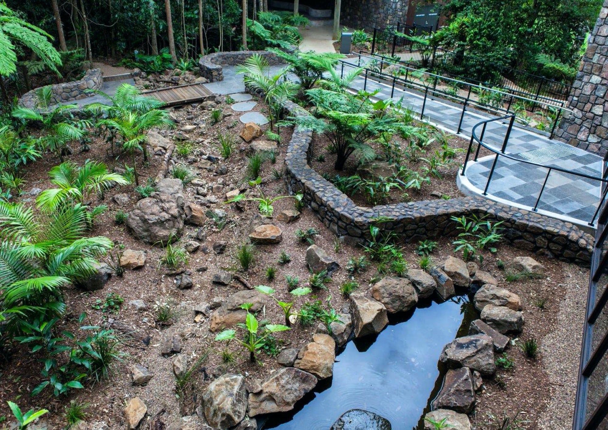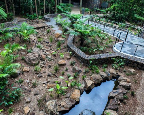 The majority of the materials used in the construction of the project were sourced locally. The building walls were clad in locally sourced Blue stone which we handpicked and the external meandering walls are pitched in Maleny bush rock excavated from a local farm. Great care was taken to cultivate existing soil and reuse materials such as stones and logs, soil, mulch and leaf litter to reduce potential introduction of pests and diseases into a highly sensitive area. No new soil was allowed to be introduced and all mulch was screened to remove potential weed seeds before being spread around. The project consisted of stone tiling with bluestone crazy pave and two types of bluestone tiles in 3 different sizes.