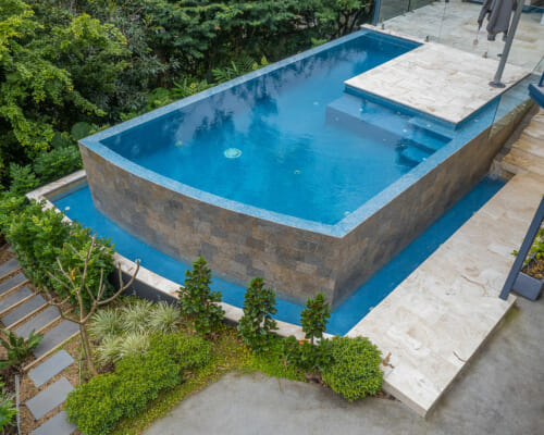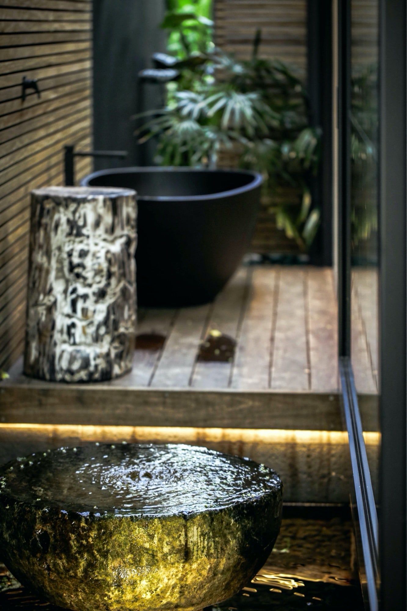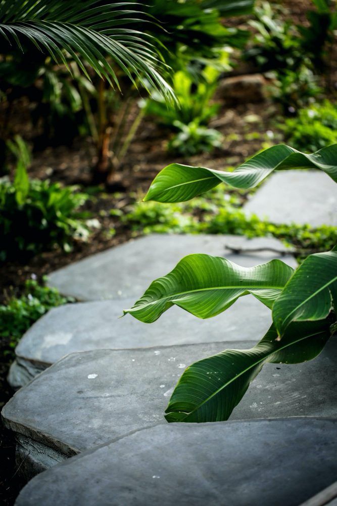 Tropical planting surrounds this design and ties this feature of the garden in with the rest of the landscaping around the home.