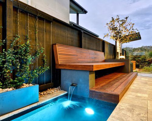 The feature entry for this home incorporates wamberal stone clad curved bench seating around a firepit with surrounding blue stone steppers interspersed with zoysia no mow grass. The noise of water running over the sandstone feature into the large pond takes you away to another place.