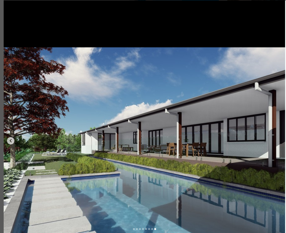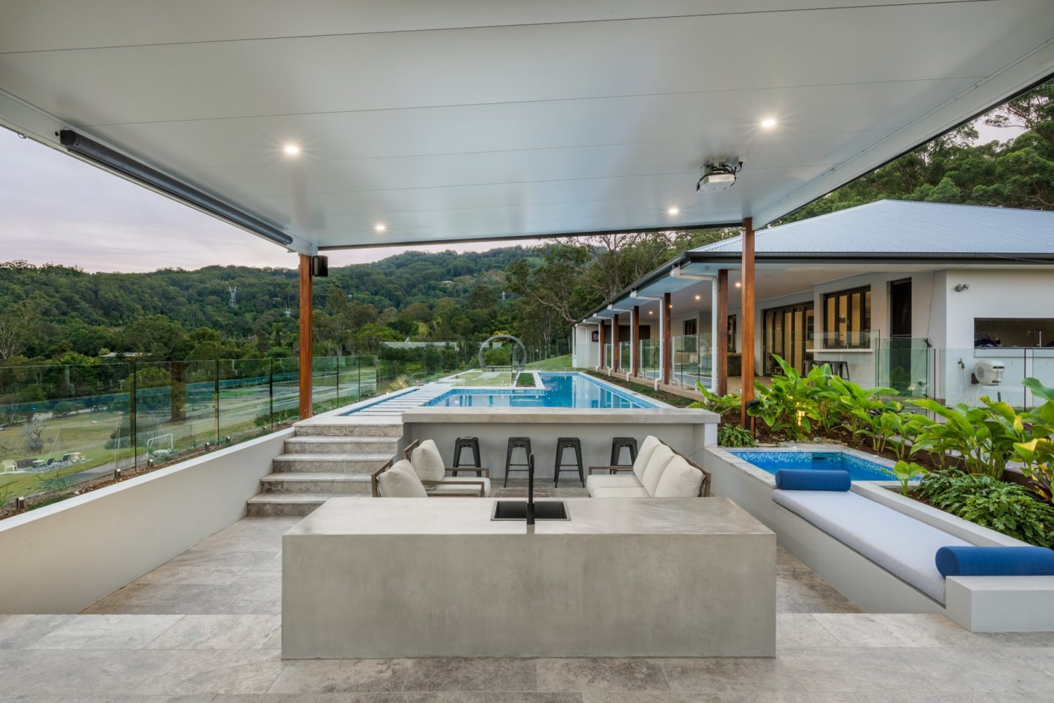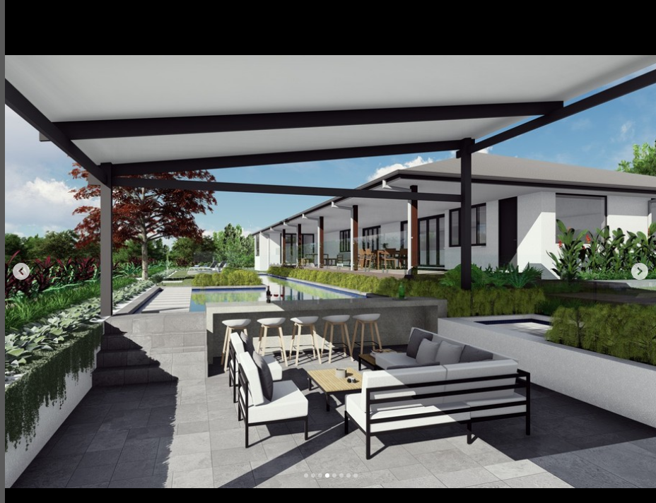 landscaping including 20m lap pool, kitchen and firepit area.