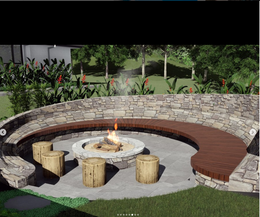 including a centre firepit plinth with corten firebowl insert. Wooden slats were installed as a seat