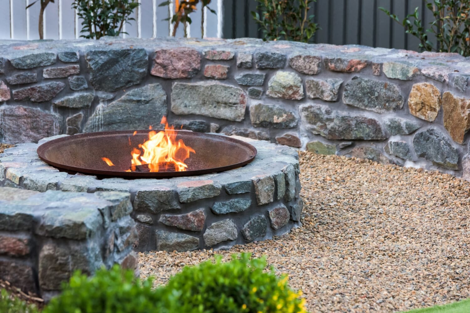 firepit insert. The surrounding seating is also clad in natural local stone with a pebble base.